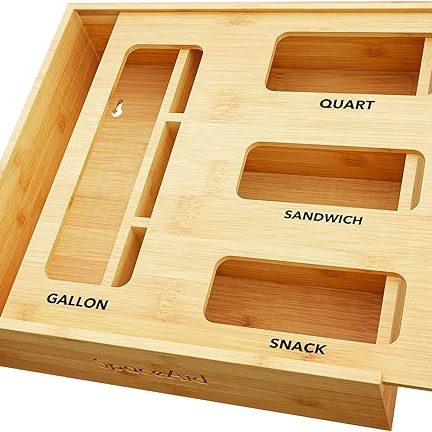 SpaceAid Bag Storage Organizer for Kitchen Drawer, Bamboo Organizer, Compatible with Gallon, Quart, Sandwich and Snack Variety Size Bag (1 Box 4 Slots), $23.98