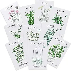 Sereniseed Certified Organic Herb Seeds (10-Pack) – Non GMO, Heirloom – Seed Starting Video – Basil, Cilantro, Oregano, Thyme, Parsley, Lavender, Chives, Sage, Dill Seeds for Indoor & Outdoor Planting, $9.99