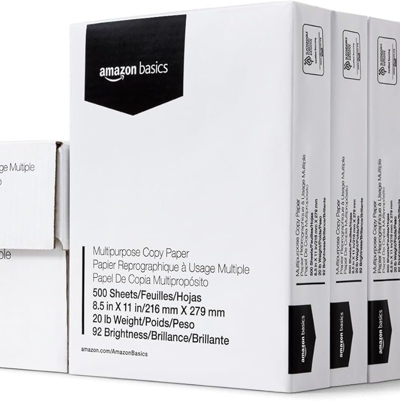Amazon Basics Multipurpose Copy Printer Paper, 20 lb, 8.5 x 11 Inches, 8 Reams (4,000 Sheets), 92 Bright, White, $44.80