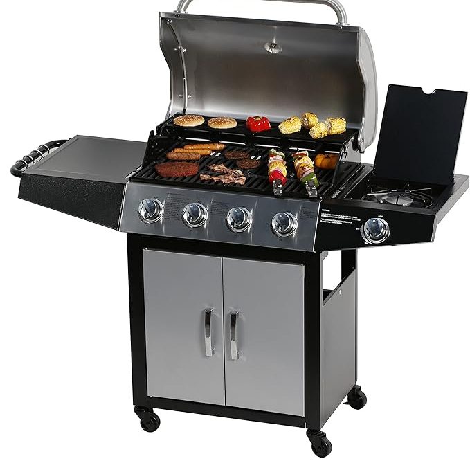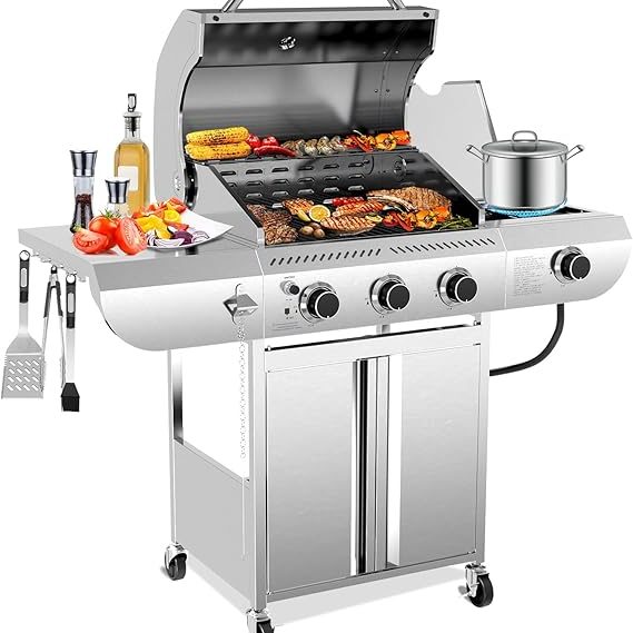 MASTER COOK 4 Burners Gas Grill, 52,000 BTU Cabinet Grill, Propane Grill, with Side Burner, Built with Stainless Steel, Silver & Black, $279